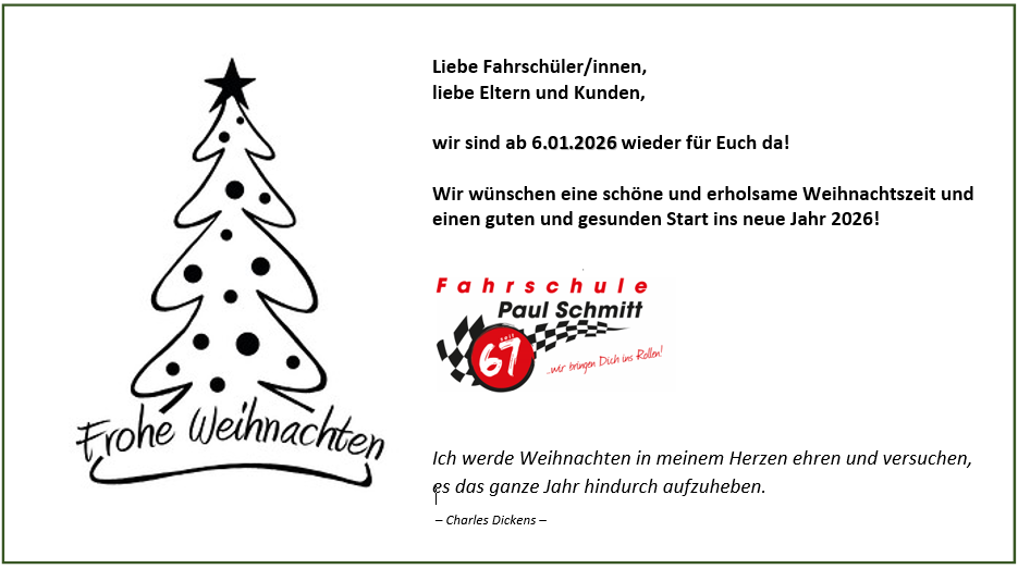 In dieser Zeit findet kein Unterricht statt. Am Dienstag, 03.01.23, sind wir dann wieder für Euch da. Dann starten wir auch wieder mit den Theorie-Unterrichten.